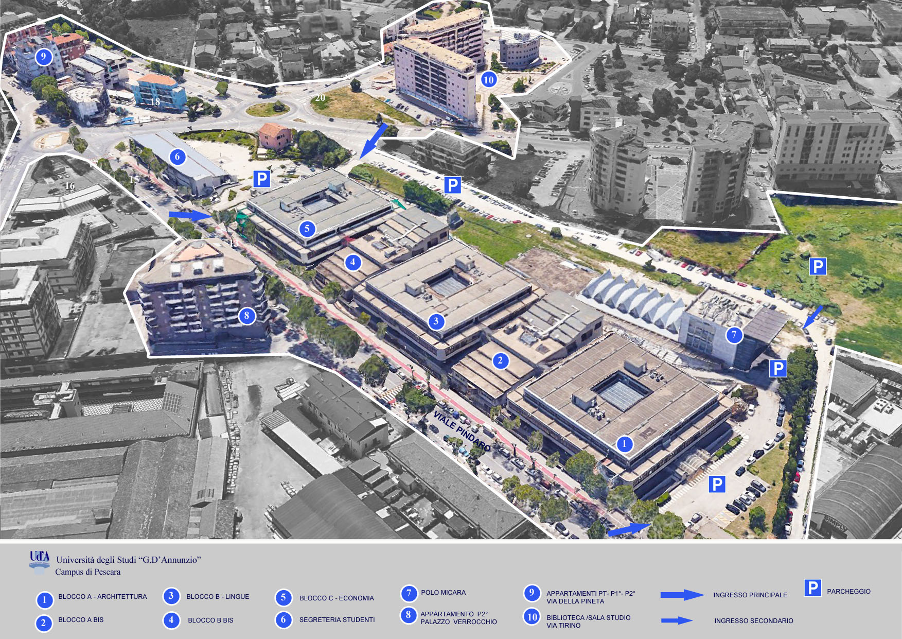 The Pescara University Campus is harmoniously integrated into the city's urban landscape, positioning itself as one of the main hubs for urban development.Situated in an area offering a wide range of services for students and the academic community, the Pindaro Campus showcases architecture solutions centered on research excellence, quality, and technological innovation in both materials and construction techniques. Particular attention is devoted to energy efficiency and environmental sustainability.The structure is located along the newly developed "greenway," an ecological corridor conceived to link both established and emerging landmarks in this part of the city, including the judicial district, new tertiary and residential complexes, and university facilities that are either already in place or under construction. ServicesIn front of the northern entrance to the Pescara Campus, you will find the Student Services building.Within the main building of the Pindaro Campus is the recently renovated Interfaculty Library, which provides students and faculty with modern, well-equipped study and research spaces.How to Reach PescaraBy Air: Abruzzo Airport offers regular flights from Milan, Turin, and Catania. The airport is located a short distance from the city and is well connected by public transportation and taxi services.By Train: Direct trains from Milan, Bologna, Rome, Naples, and Bari arrive at Pescara Central Station, conveniently located in the heart of the city center.By Car: From Milan, Bologna, Bari: take the A14 motorway, exit at Pescara Ovest.From Rome: take the A25 motorway, and exit at Pescara Ovest.